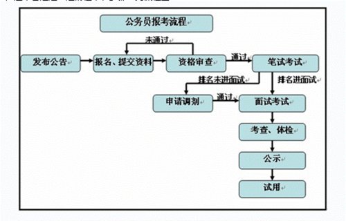 國家公務員招考由各級人事部門統一部署安排,在具體細節上會因地域、部門的差異而不同,因此要以主管招考的相關部門的規定為準。但通常情況下都要會經過一定的程序和步驟:即下面的流程圖: